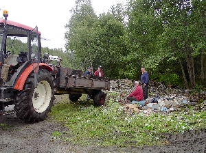 Dugnad 19. mai. Rydding på garasjetomta og såing av den nye plenskråninga mot Bø.